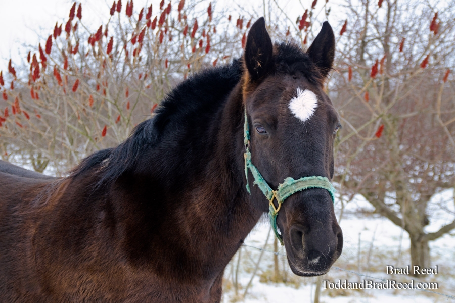 After having the flu for several days, photographing this beautiful horse was definitely a bright spot in my day. I worked hard at making the horse comfortable with me so I could pose him just the way I needed for my photograph. The key to this composition is how the red sumac behind the horse looks like a musical score and his ears and head relate to the background.