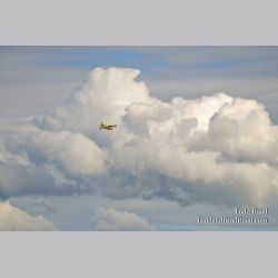 A seaplane flies through the clouds above the Straits of Mackinac en route from Michigan's Upper Peninsula to the Lower Peninsula.