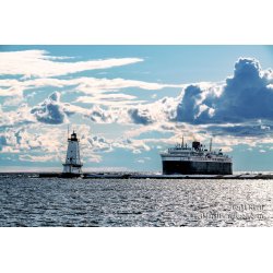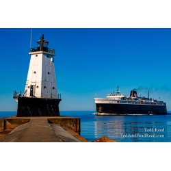 Nothing says Ludington better than the carferry Badger and Ludington lighthouse. On this July evening the Lake Michigan Carferry passes the Ludington North Breakwater Light en route to its dock after ferrying passengers and vehicles from Wisconsin.