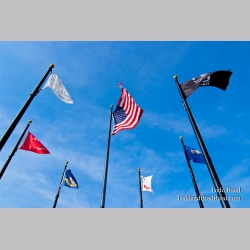 The American Flag and the flags of all five Armed Forces of the United States and the POW-MIA Flag flutter in the breeze on Veteran's Day. The flags are located at the Veteran's Memorial on US 10 between Ludington and Scottville at Oak Grove Funeral Home.