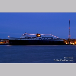 Several months ago I spotted red light from the Shop-N-Save sign being cast subtly on a dry manhole cover in front of the Ludington supermarket. I pre-visualized then how the manhole cover would look when wet. I love a rainy night! Little did I know that Brad would shoot a photo later in the night near here.