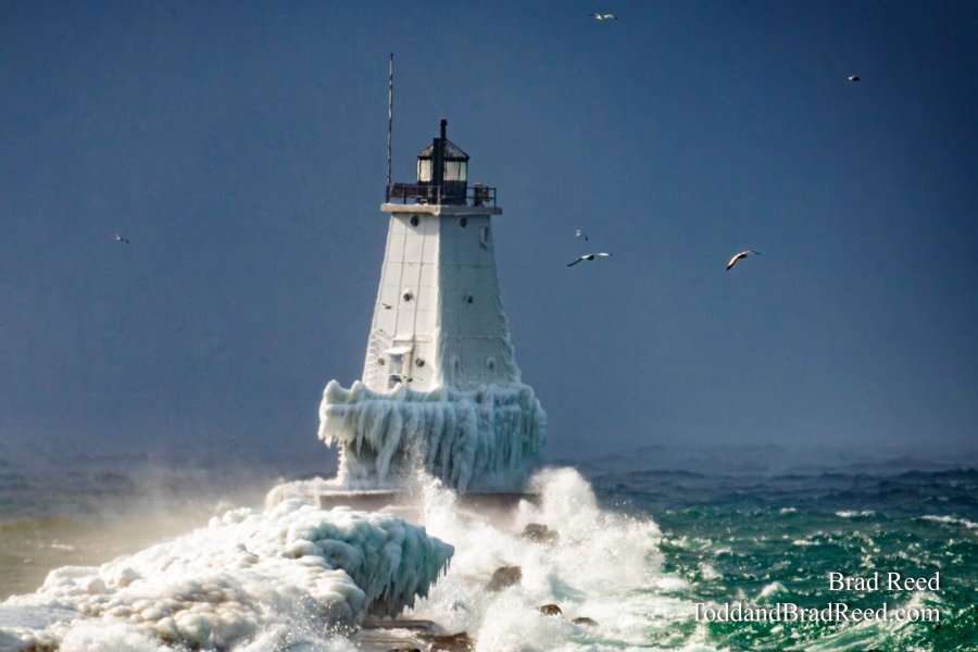 Ludington lighthouse with ice and waves. 1/2025